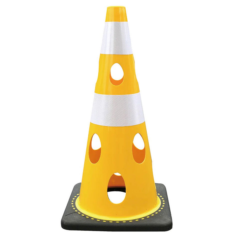 穴あきソフトコーン・イエロー/白高輝度反射(PVC/ゴム・φ40上部凹凸加工/高さ700mm) 穴あきコーン 風抵抗軽減コーン 倒れにくコーン ソフトコーン